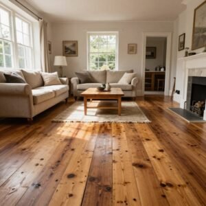 Pitch pine: Salvaged from Victorian industrial buildings, warehouses, mills, and schools. Pitch pine is an exceptionally hard, resinous timber that takes on a deep amber to reddish-brown colour with age. It is almost impossible to source new (the old-growth forests that produced it no longer exist at commercial scale), which means reclaimed pitch pine flooring is genuinely irreplaceable. It is typically found as wide boards — 150–200mm or wider — and has the hardness to withstand significant foot traffic and decades of further service.